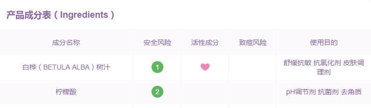 舒缓抗敏、活性保湿——来源于桦树汁的神奇魔力,不仅补水保湿性能非常好,能促进肌肤的水润自循环,帮助角质层维持在一个良好的含水量水平而且能及时镇定皮肤,无论是晒红、过敏、熬夜红血丝,轻轻喷一喷都能帮你搞定。
