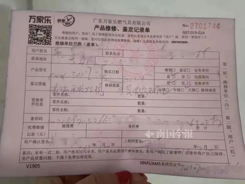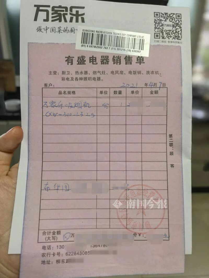 黄先生说,这台万家乐抽油烟机是去年4月在实体店买的。去年7月,因抽油烟机面板上其中一块钢化玻璃掉落,黄先生联系维修师傅来,更换了一块钢化玻璃。想不到,今年4月,这块钢化玻璃发生爆裂。
