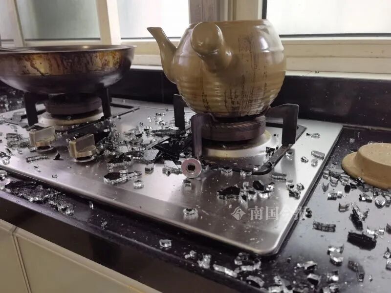 记者看到,黄先生家的灶台上,全是玻璃碎片。炒菜锅和一个砂锅里,也满是玻璃碎片。“幸好当时没有人在炒菜,不然碎片四溅,肯定会发生流血事件!”黄说,玻璃碎片棱角锋利,飞入眼睛,后果不堪设想。