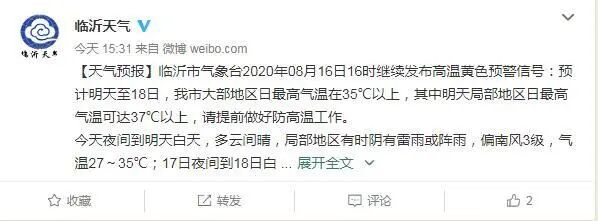 临沂继续发布高温黄色预警信号8月16日16时,临沂市气象台继续发布高温黄色预警信号,预计17日至18日,临沂大部地区日最高气温在35℃以上,其中明天局部地区日最高气温可达37℃以上,请市民提前做好防高温工作。