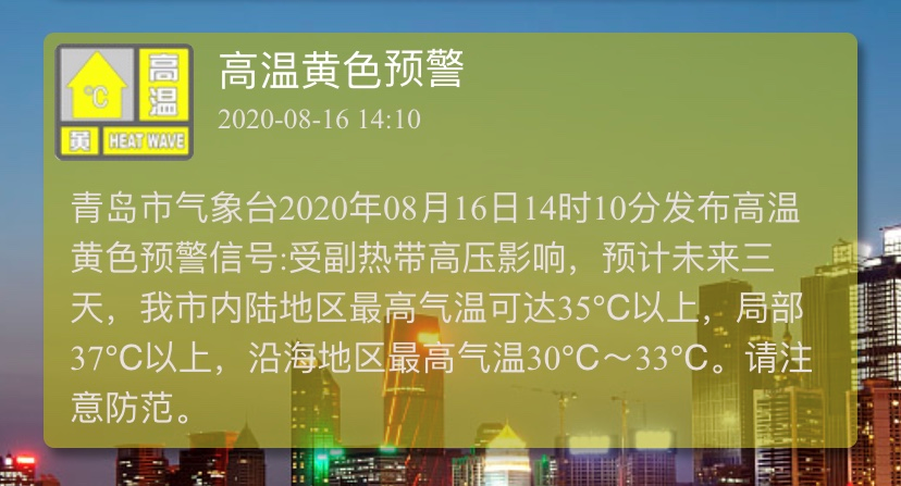 青岛发布今年首个高温黄色预警!青岛市气象台2020年08月16日14时10分发布高温黄色预警信号:受副热带高压影响,预计未来三天,我市内陆地区最高气温可达35℃以上,局部37℃以上,沿海地区最高气温30℃~33℃。