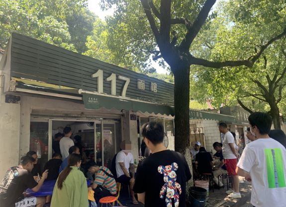和许多传统面店一样,117面馆也是个“家族产业”,但不同于大多“子承父业”的规矩,这家面店的主厨是老板娘和年轻的儿子,老板则是负责招呼客人点单结账面馆门面不足十平方米,店内两张4人位的桌子、一张5人位的长桌,最多只可容纳十几位客人,人一多,老板就在店门口摆上三张圆桌,供大家坐下吃面。