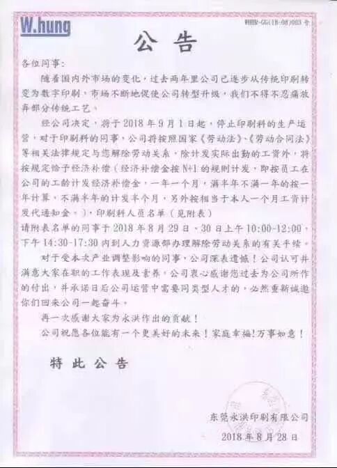 告别传统胶印永洪公告称,过去两年,公司不断从传统印刷转向数字印刷,市场也促使公司向数字印刷转型升级,公司不得不忍痛割舍部分传统工艺自2018年9月1日起,东莞永洪印刷有限公司将停止印刷科的生产运营,所有印刷科同事将解除劳动关系。