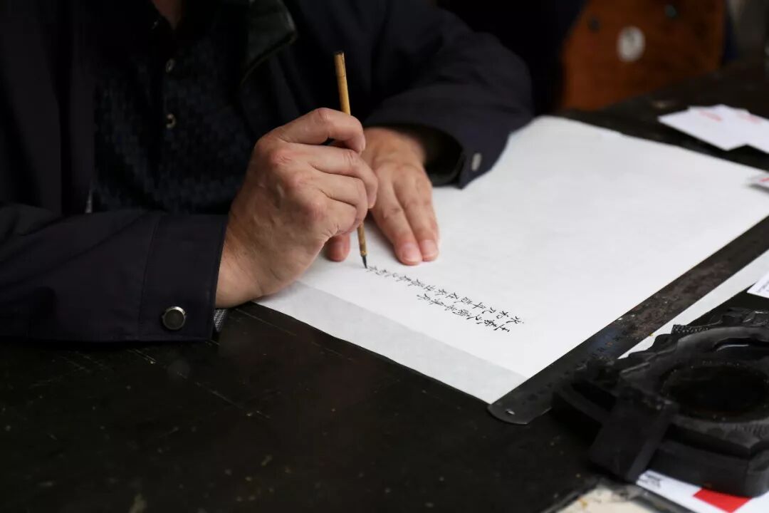 为苏大脸演示写样的这位江苏省非物质文化遗产代表性传承人芮名扬老师,已经在这些薄薄的宣纸上笃定地写了50年, 凝气、定神、提笔、落墨,一行行妍丽秀逸的小楷黑字,展现在纸面上,工整程度可谓“人肉打印机”,更为后续的雕版工艺打下了绝佳的基础。