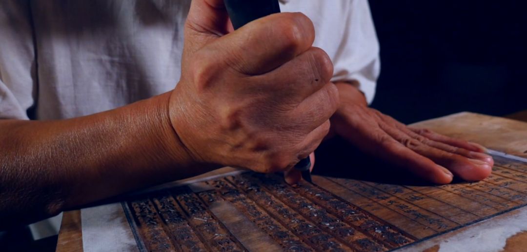 其次刷印本身也是一项非常考验技巧的工作,它需要经验丰富的刷印师将松烟墨汁用棕帚均匀的轻扫版面,覆上宣纸后,再用棕擦重擦,过程中其手腕拿捏轻重分寸都是学问,而且每一种版面需要的力道都不相同刷印完成后,待版面上的字迹逐渐在纸张上浮现,轻轻掀起,一张单页就完成了。