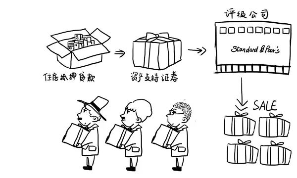 在美国个人向银行等放贷机构申请住房抵押贷款放贷机构再将住房抵押贷款作为一种资产“卖给”投行投行将各种住房抵押贷款打包成“资产支持证券”经由标准普尔等评级公司评级然后再出售给保险公司养老金、对冲基金等投资者
