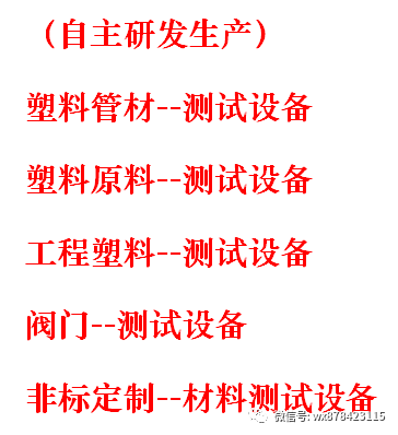炭黑分散测试仪、 差示扫描量热仪、 马弗炉(灰分试验机)、快速水分测定仪、 交联度实验仪、 检查井落锤冲击试验机、检查井力学综合性能试验机、 检查井力学综合性能试验机(密封性负压机构(变形及偏角))、 拉拔试验箱、 管材不透光率测定仪、 管道适用性综合性能试验机、 管道真空负压试验、 滴灌管(带)水利性能综合试验台、 滴灌带拉拔试验机、 塑胶跑道冲击吸收和垂直变形试验机、 跑道面层滑动阻力测试仪、 密度天平、 塑料管材静压热稳定试验机(简称8760)、 耐慢速裂纹增长(锥体试验机)、 耐快速裂纹扩展(RCP)试验机、 密度梯度计、真空落锤、 电热鼓风烘箱(纵向回缩率试验机) 高压爆破试验机(10MPA-400MPA)