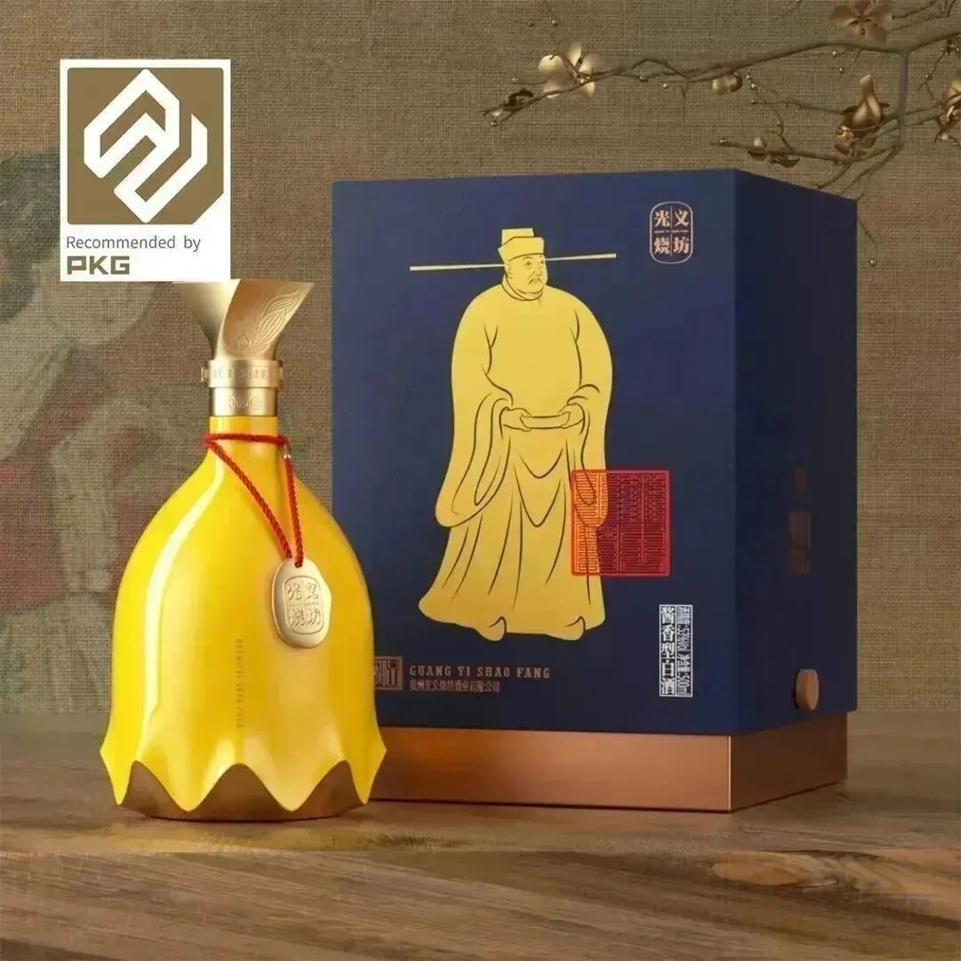 图文来源:包联网04 光义烧坊酒以宋太宗赵光义形象及印章等作为包装设计主视觉元素,尽显帝王霸气,包装侧面印有宋太宗诗词:缘识。瓶盖方形,源于宋太宗官帽;瓶底八只四对官靴,面朝四方。