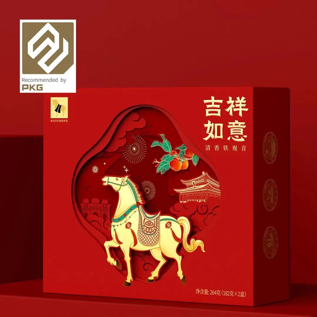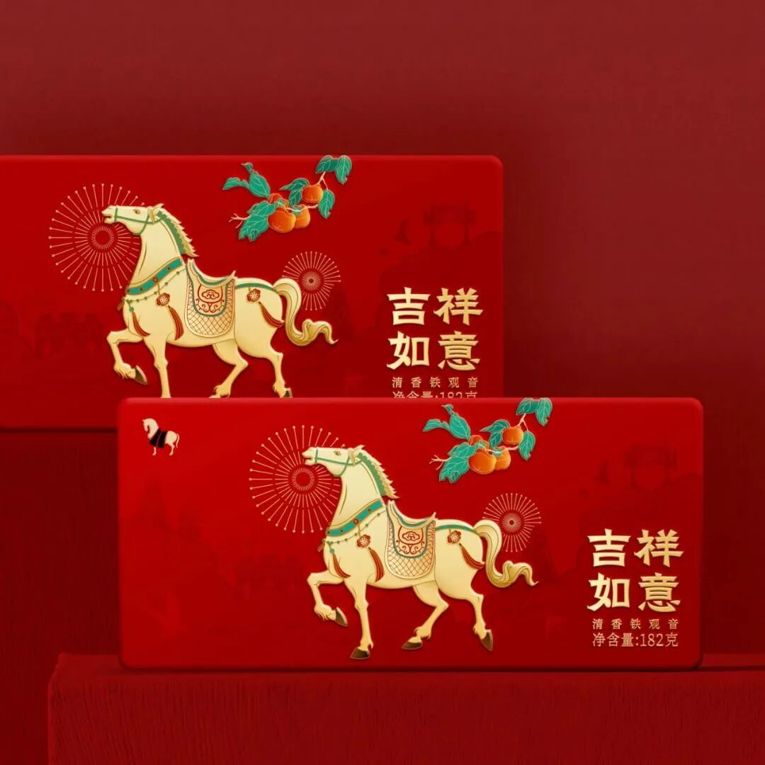 图文来源:包联网02 八马茶业礼盒包装设计通过“吉祥如意”品名为设计出发点,以代表“吉祥”的柿子图形为画面窗口,用剪纸的方式展现了一幅铁观音原产地美轮美奂场景风姿绰约的俊马,闲庭信步而来,展现出八马茶业品牌的自信和卓越品质,整体设计简洁且具有强烈的节日气氛和茶礼属性。
