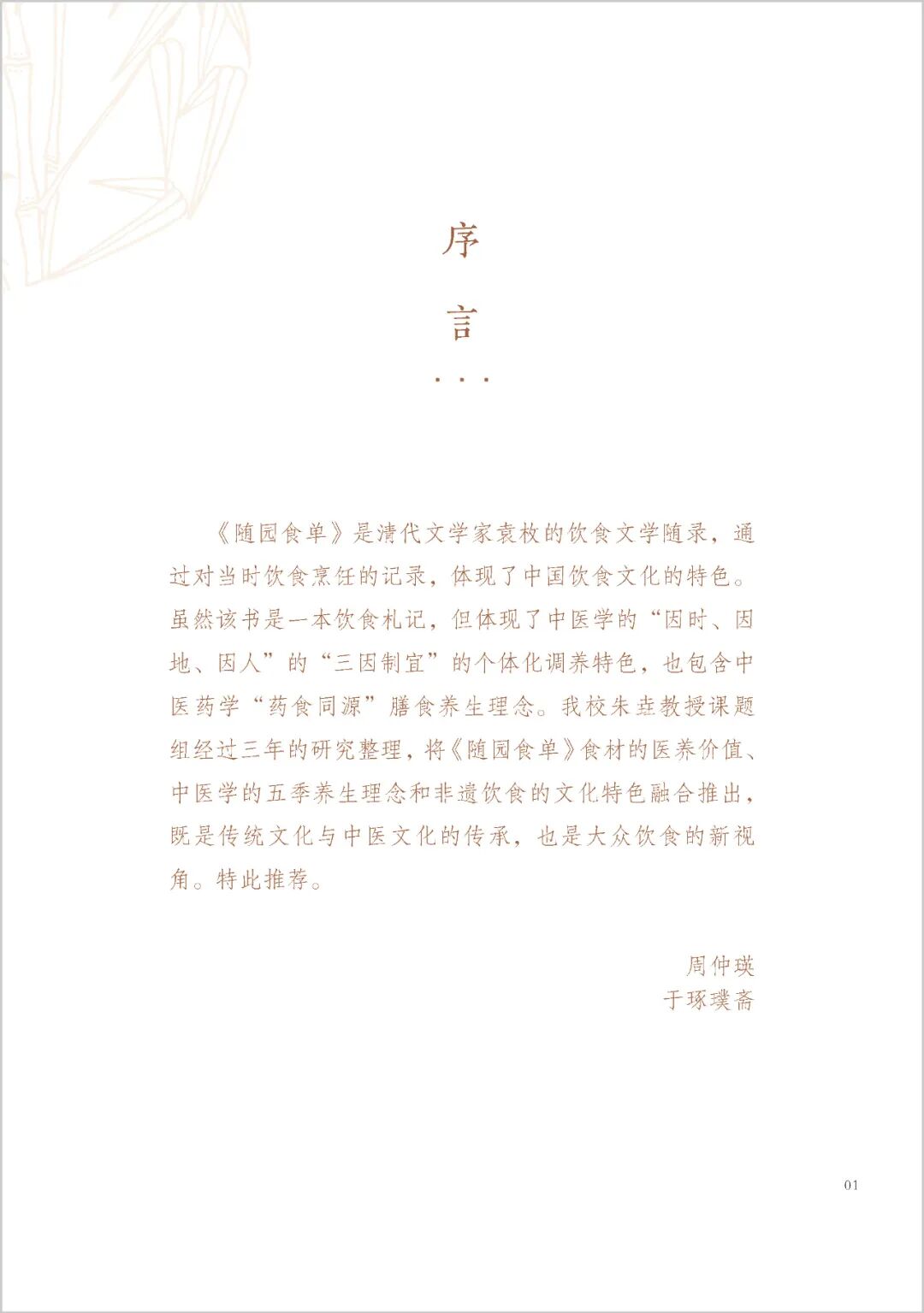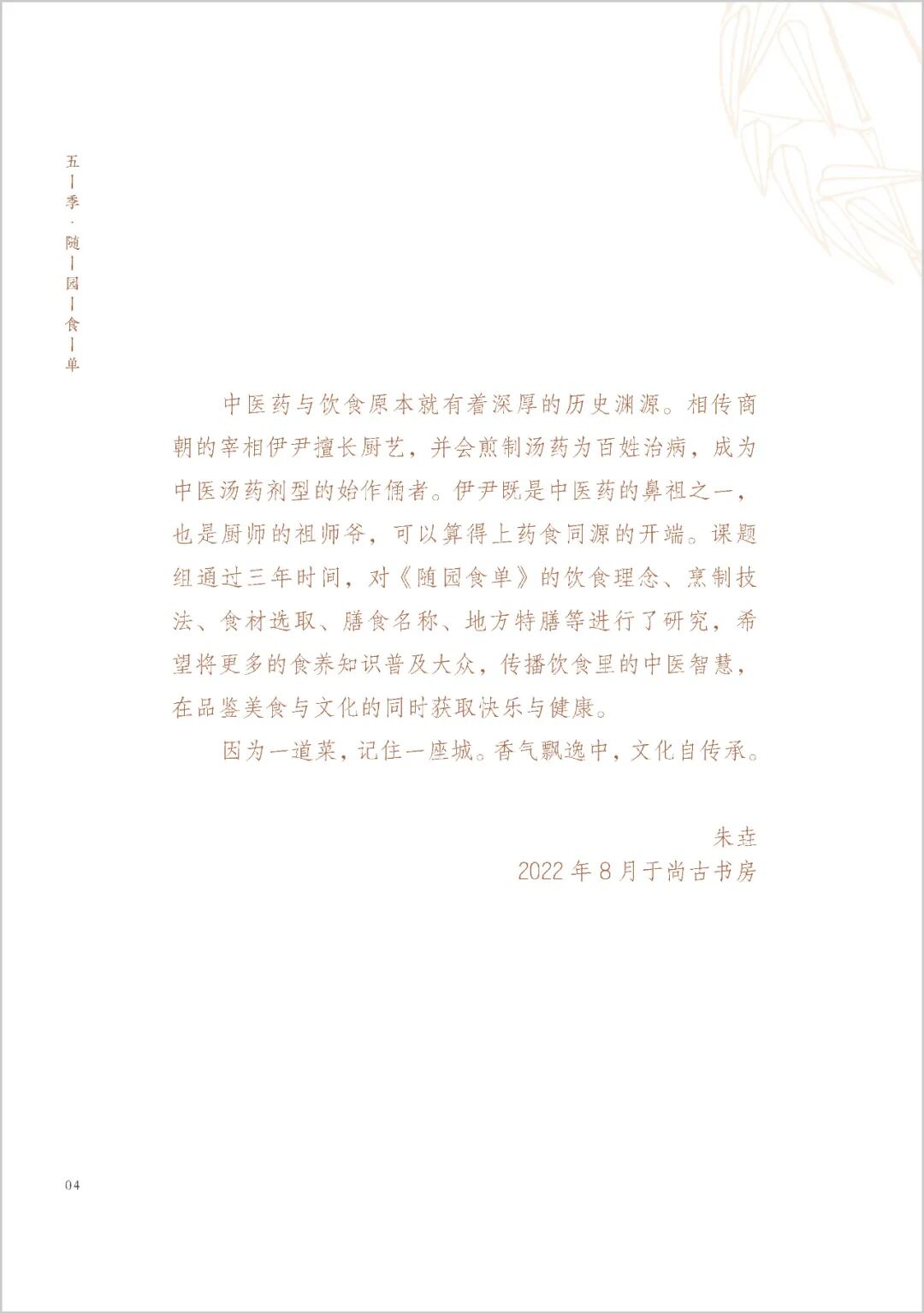 相传商朝的宰相伊尹擅长厨艺,并会煎制汤药为百姓治病,成为中医汤药剂型的始作俑者伊尹既是中医药的鼻祖之一,也是厨师的祖师爷,可以算得上药食同源的开端课题组通过三年时间,对《随园食单》的饮食理念、烹制技法、食材选取、膳食名称、地方特膳等进行了研究,希望将更多的食养知识普及大众,传播饮食里的中医智慧,在品鉴美食与文化的同时获取快乐与健康。