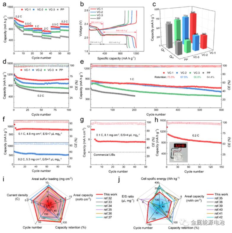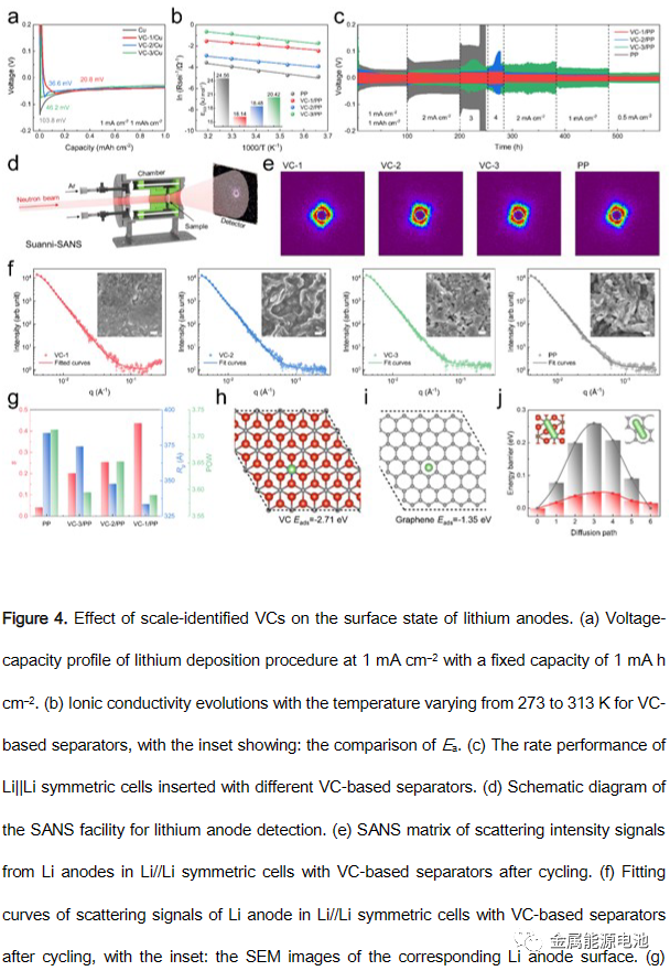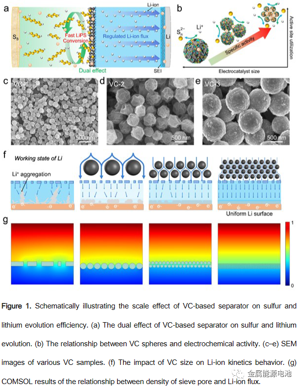 (i) 由于有大量的活性位点,VC成为高效的多硫化锂(LiPS)清除剂(ii) 由于规模效应,VC对Li2S的成核和分解反应动力学表现出明显改善的电催化功能(iii) 由于独特的离子筛效应,VC可以调节Li。