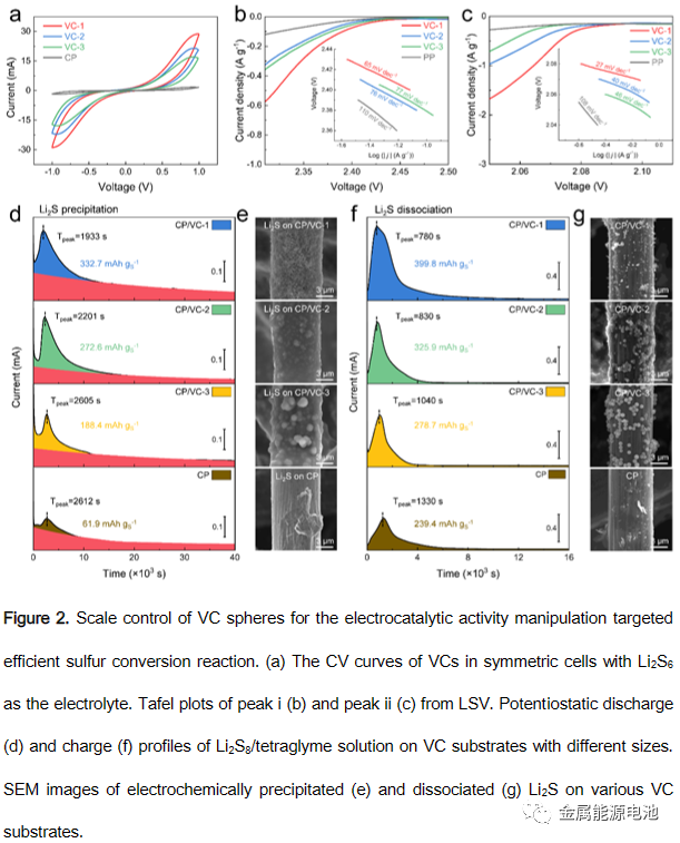 【主要结论】综上所述,作者实现了对VC球体从1000到150纳米的尺度操作,以调整其在Li-S电池中的电化学活性结合实验和理论分析,在1000到150纳米的范围内,VC的催化活性可以随着其尺寸的减小而增加。