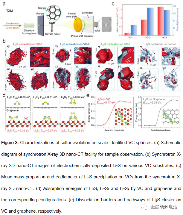Li-S电池中硫和锂物种的进化结合同步辐射X射线三维纳米计算机断层扫描(X射线三维纳米CT)、小角中子散射(SANS)技术和第一原理计算,作者发现VC的活性可以通过调整尺度而达到最大化,所获得的功能进行如下。