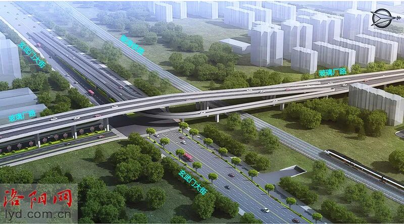玻璃厂路向北打通工程,南起九都路,北至瀍涧大道,项目全长2.85公里,主要为高架快速路结构其中,高架桥标准段面设计宽24.5米,双向六车道布置,先后上跨凯旋路、中州中路、唐宫中路、玄武门大街、陇海铁路、春都路以及瀍涧大道,在瀍涧大道向东转,最终在定鼎北路落地,设计时速60公里,全线设置5处、13条上下匝道。