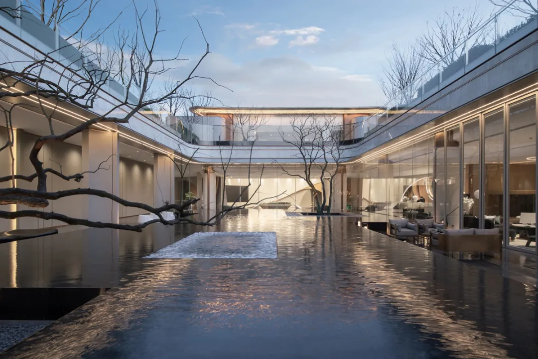 曲线的造型也运用到下沉庭院的形状,以及水池、灯带等景观元素中