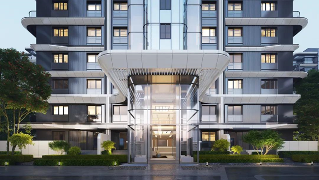 北京中海甲叁號院入户门头效果图重庆融创壹号院外表是充满现代的材质,考验工艺的弧形设计;外窗占比约0.37,外窗约2cm的全隐框的设计,立面更加纯粹。像一块无懈可击的“曲面屏”。