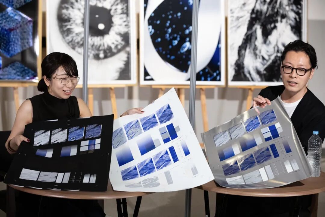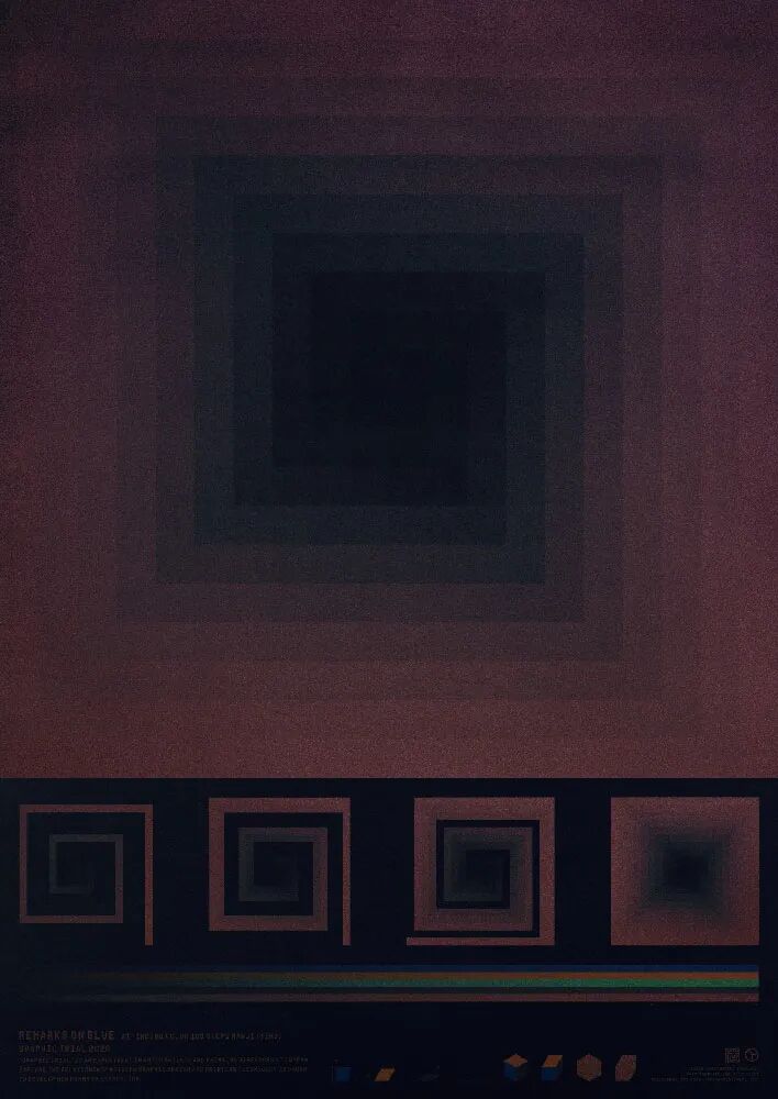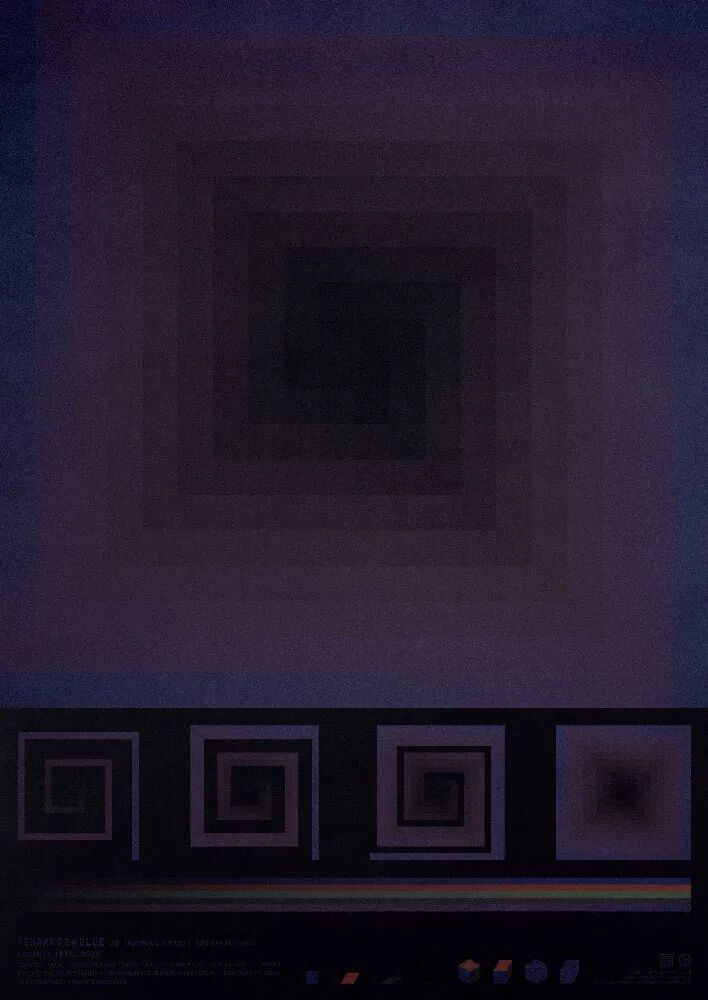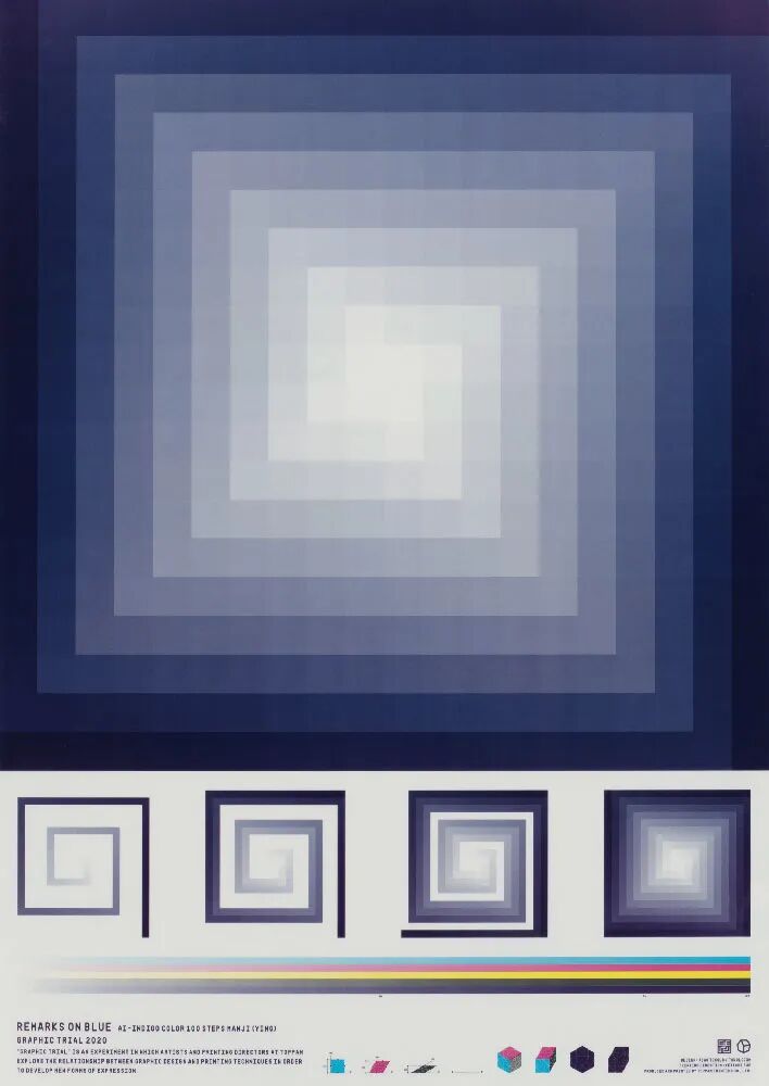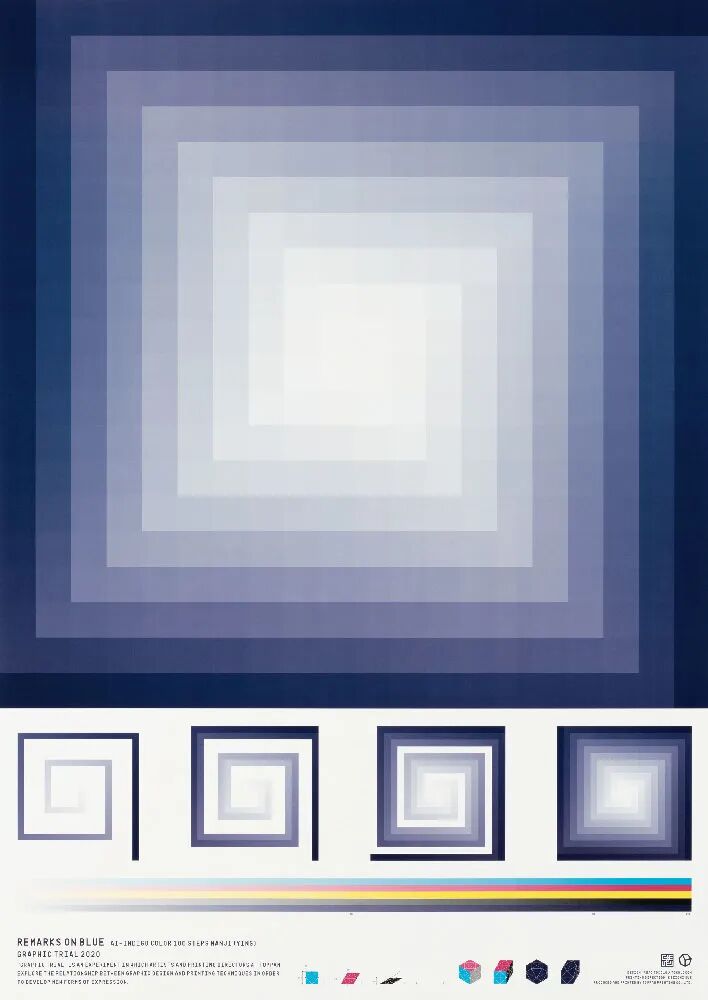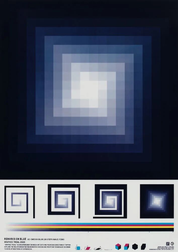 根据时间而变化的显色在日本传统文化中,蓝色有着各种各样的形态,例如藏青色、群青色等作品呈现出以蓝色浓度为网格形成的中心轴,最浅的蓝色浓度为1,最深的则为100通过改变温度、印刷次数、顺序、用纸材质等来改变显色。
