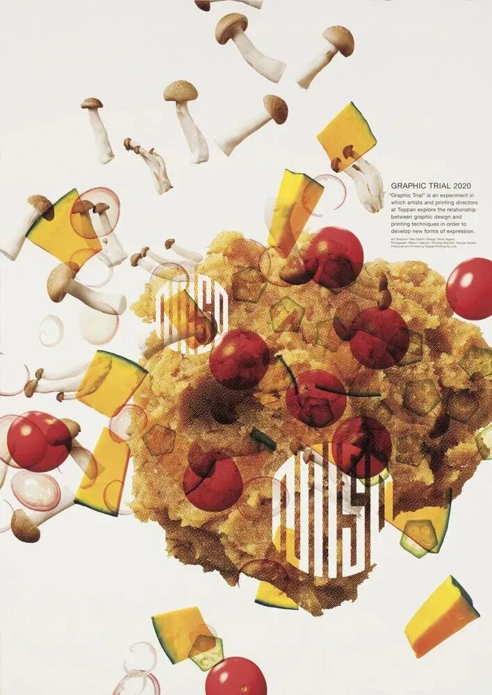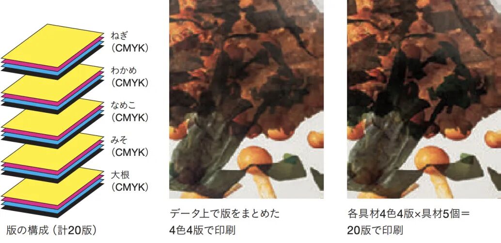 海报中的5种食材的印刷顺序为:南瓜→姬菇→小番茄→两道亮光清漆(以使小番茄更有光泽)→秋葵→味噌→日本生姜本着对食材的尊重,佐藤卓用4种印刷色来表达每种成分,使其成为拥有着26种颜色的“豪华印刷品”