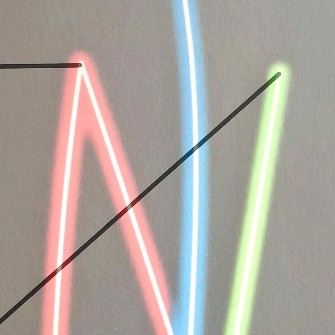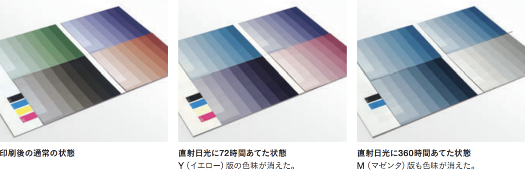 不同墨水浓度的显像,从左至右:未稀释、25%浓度、50%浓度墨色是这组作品的亮点之一为了适配每一幅的荧光色彩,佐藤针对不同配色的画面调配了不同浓度的Sumi墨水,并进行二次哑光处理例如下图,右边完成品则是在左图的基础上印制了3种荧光色,以及混合了60%不透明度白色的Sumi墨水。