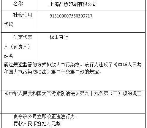 区环保局依法责令上海凸版有限公司改正,并处罚款