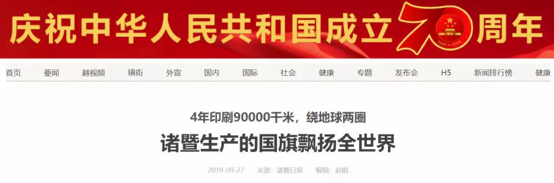 据诸暨日报报道,该企业4年来印刷国旗长达9万公里,可绕地球两圈。