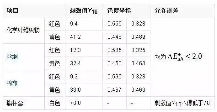 国旗颜色标准样品》准确规定了国旗所使用的颜色。该标准按照CIE标准照明体D65和CIE 1964补充标准色度系统给出了下列的色度数据。