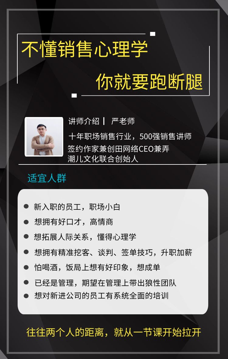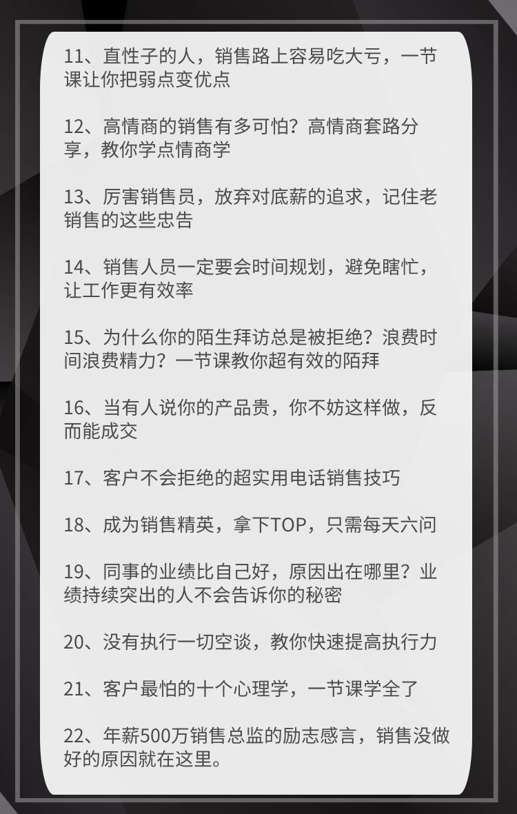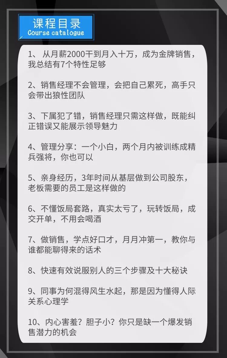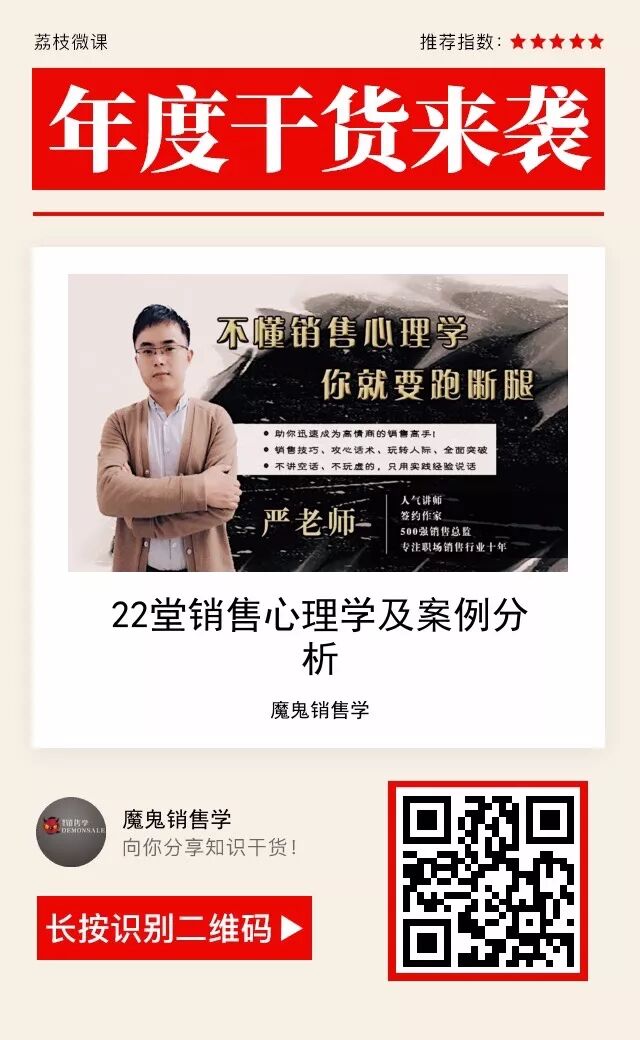 不管你从事什么行业,卖房子的也好,卖车的也罢,很多销售技巧都是相通的这套《22堂销售心理学课程》的课程已经上线目前处于预售阶段,原价99元,现预售特价59元全套课程共计22节课,几乎涵盖销售中所有常见难题。