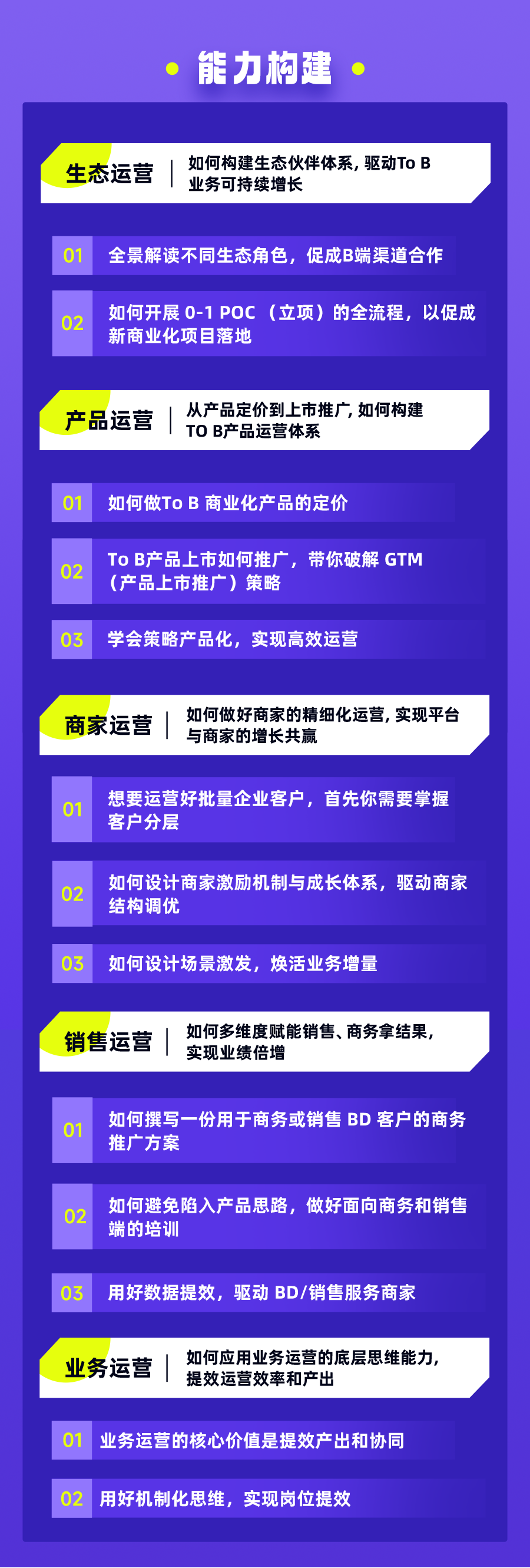 最后,一些你需要知道的:适合人群B端运营:身处产品服务型企业,迷茫B端运营如何发挥价值,希望未来跳槽到BAT大厂做B端商家/产品运营BD/客户成功等业务人员:管理提效,希望能从1V1单打转型为批量运营客户;能够见B端生态及业务打法,促业绩达成。