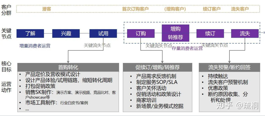 其次还需要考虑如何提效和帮助前线销售的工作:通过运营做销售转化链路设计,及销售培训、销售工具包的支持(2)客户服务环节:当客户进来之后,to B运营的核心目的是要考虑怎么提升客户对我们产品和服务的满意度,进而在过程中产生增购、转推荐、续费等行为。