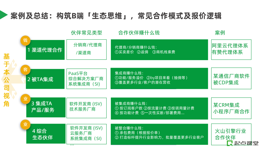 (1)营销获客环节:在销售的单点转化外,而运营需要考虑的是批量转化比如通过与行业上下游,商圈商会,行业展会等渠道的合作(常见的有分销/集成/代理),挖掘批量招商和获取客户的机会;或者是挖掘新的业务模式,通过与合作方/客户共创带来新的营收机会。