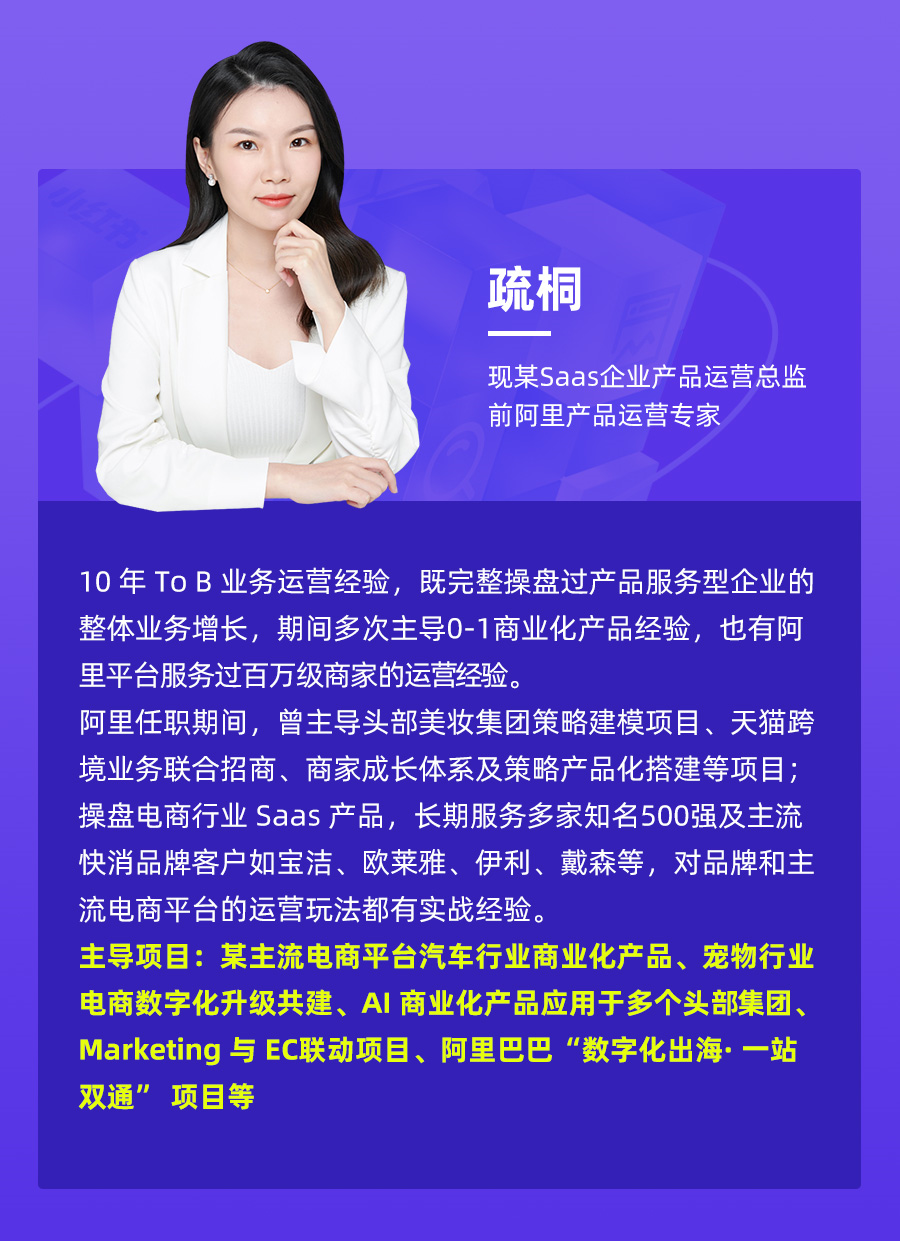 我们联合现某Saas企业产品运营总监、前阿里产品运营专家@疏桐老师(既完整操盘过产品服务型企业的整体业务增长,期间多次主导0-1商业化产品经验,也有阿里平台服务过百万级商家的运营经验),强强联手,共同研发上线了