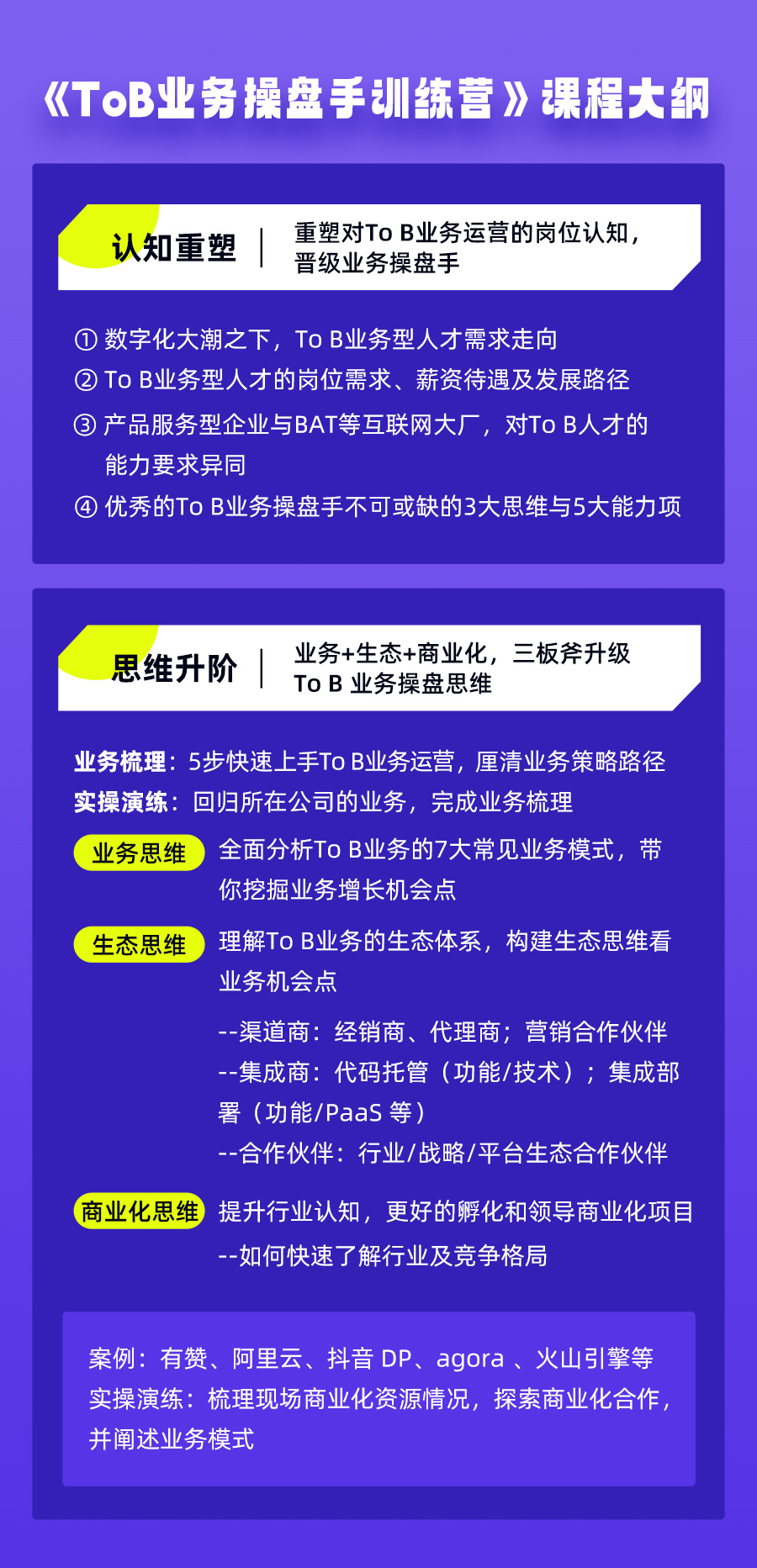 《To B业务操盘手训练营》课程,帮助To B从业者们突破瓶颈,成为稀缺的业务操盘手。如果你对B端业务运营很迷茫,不知道如何发力?欢迎加入一起学习!首发特惠名额限量开放,先到先得!