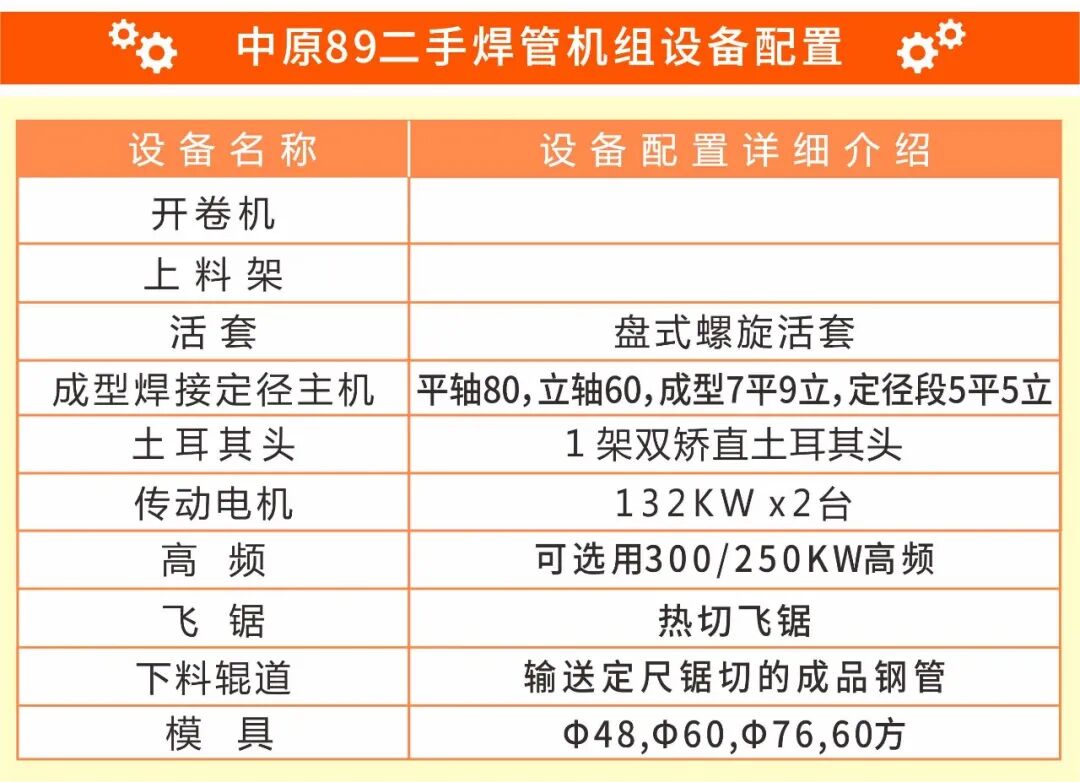 ✦++点击蓝字 关注我们· 中原89二手焊管设备·该设备进料方向为右进料。该设备能加工最大114mm直径钢管,也可以加工40X40~80X80mm的方管。不仅机器磨损少,而且配套齐全。设备组成