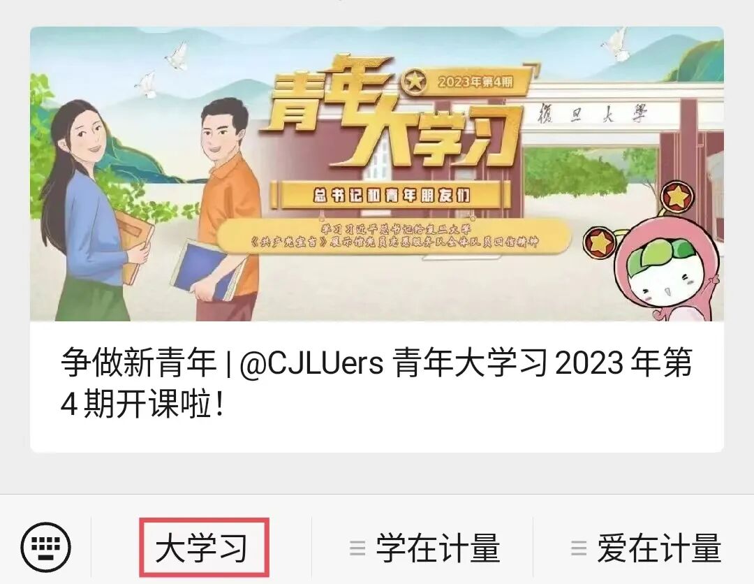 方式二关注并进入“青春计量”公众号点击菜单栏“大学习”,进入学习