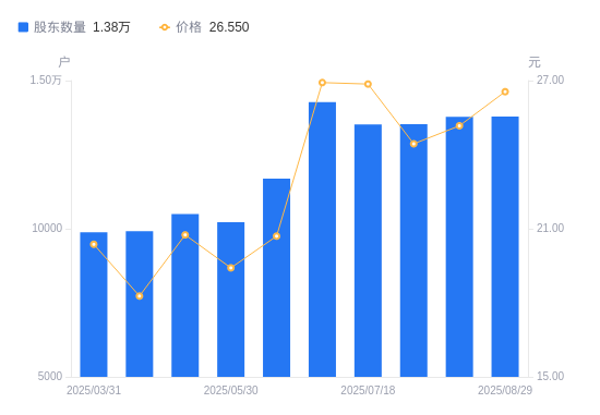 98779236.1818.81近一年(2024年9月30日至2025年8月29日),天山电子A股股东户数从1.25万户,增加至1.38万户,增幅10.04%,区间股价上涨118.43%。