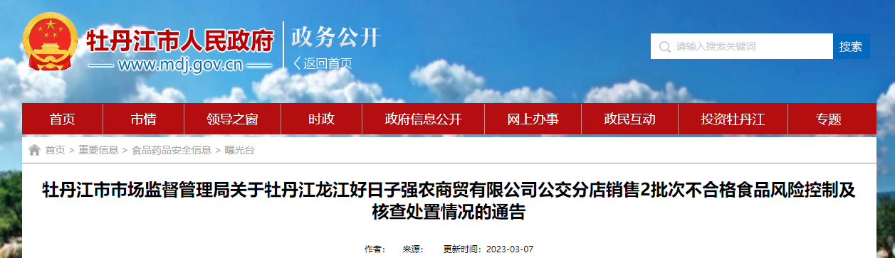 中国质量新闻网讯 2023年3月7日,黑龙江省牡丹江市市场监督管理局发布关于牡丹江龙江好日子强农商贸有限公司公交分店销售2批次不合格食品风险控制及核查处置情况的通告。