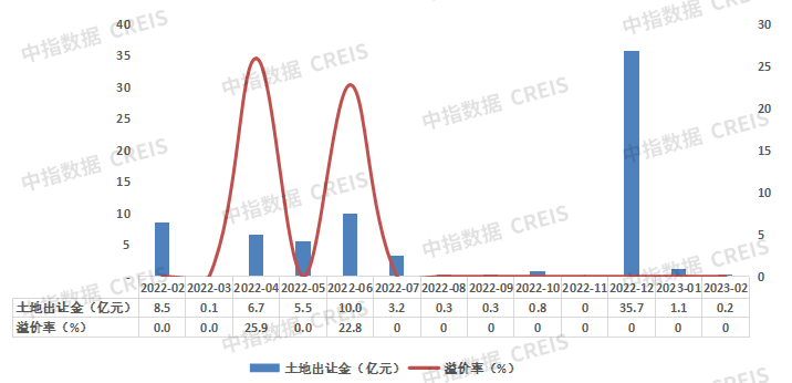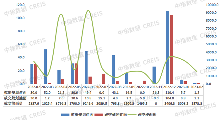 市场监测:https://www.cih-index.com/2023年2月,大连住宅用地推出规划建面1.2万㎡,住宅用地成交规划建面为1.2万㎡,成交楼面价为1573.3元/㎡图:2022年2月-2023年2月大连市住宅用地出让金和溢价率走势。