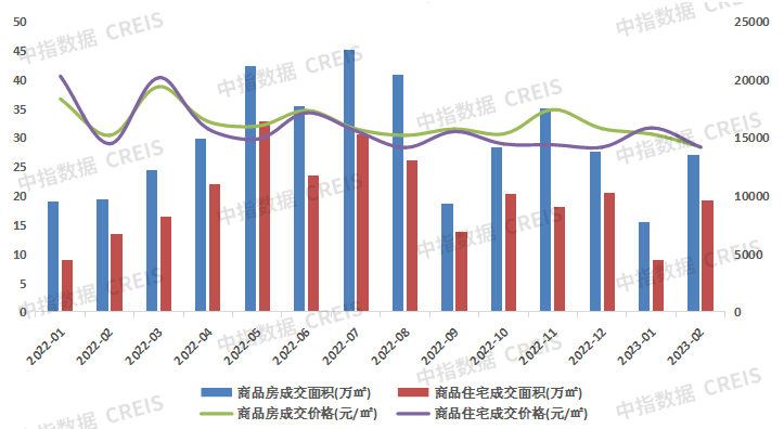 图:2022年1月-2023年2月大连市商品房、商品住宅成交量价走势