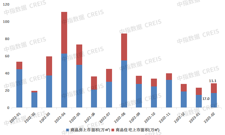 市场监测:https://www.cih-index.com/2023年2月,大连商品房供应面积为17.0万㎡,同比下降3.0%,环比增加14.3%;商品住宅供应面积为11.1万㎡,同比增加428.1%,环比增加32.9%。