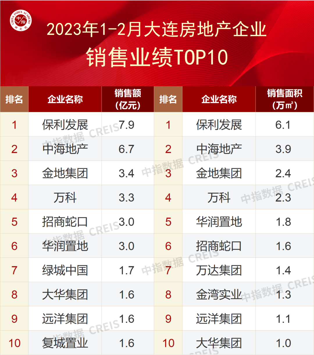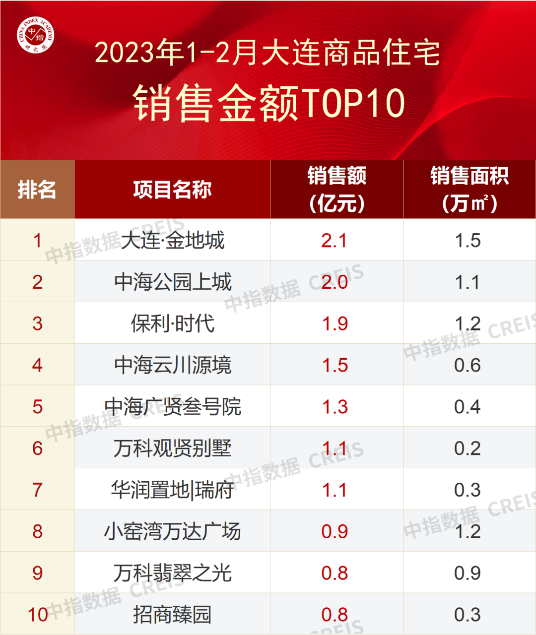 特别声明:房地产企业销售数据统计是以2023年1-2月期间销售的商品房为统计口径,主要依据中指数据CREIS(点击查看)在大连的销售数据(部分还迁项目未纳入统计)本榜单仅供参考,不保证数据的准确性、完整性及可靠性,不对使用榜单及内容所引发的任何直接或间接损失承担责任。