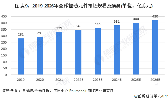根据ECIA、中国电子元件行业协会信息中心、Paumanok公布的全球电容、电感和电阻的数据,2021年全球被动元件市场规模达到329亿美元此外,根据Mordor Intelligence的预测,未来几年全球被动电子元件市场规模将以5%的CAGR增长,到2026年全球被动电子元件市场规模将达到420亿美元。