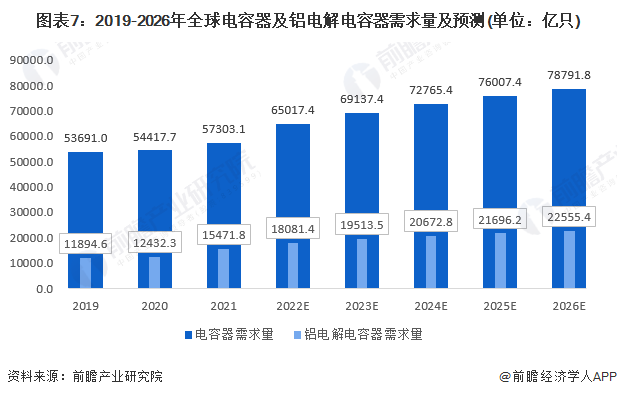 从需求量来看,2021年全球铝电解电容器及整体电容器需求量分别达到15471.8亿只和57303.1亿只,预计到2026年全球铝电解电容器及整体电容器需求量将达到22555.4亿只和78791.8亿只