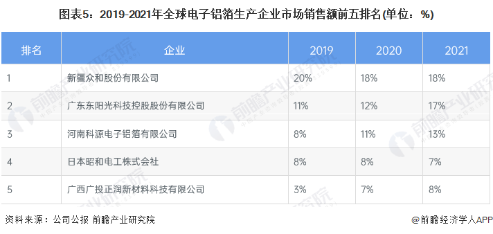 注;:上述市场规模根据下游电极箔产量及代表性企业电子铝箔均价测算新疆众和、东阳光、科源电子为全球电子铝箔市场三大龙头全球电子铝箔行业集中度较高全球电子铝箔市场销售额前五的公司主要为新疆众和股份有限公司、广东东阳光科技控股股份有限公司、河南科源电子铝箔有限公司、日本昭和电工株式会社、广西广投正润新材料科技有限公司,其市场份额如下:。