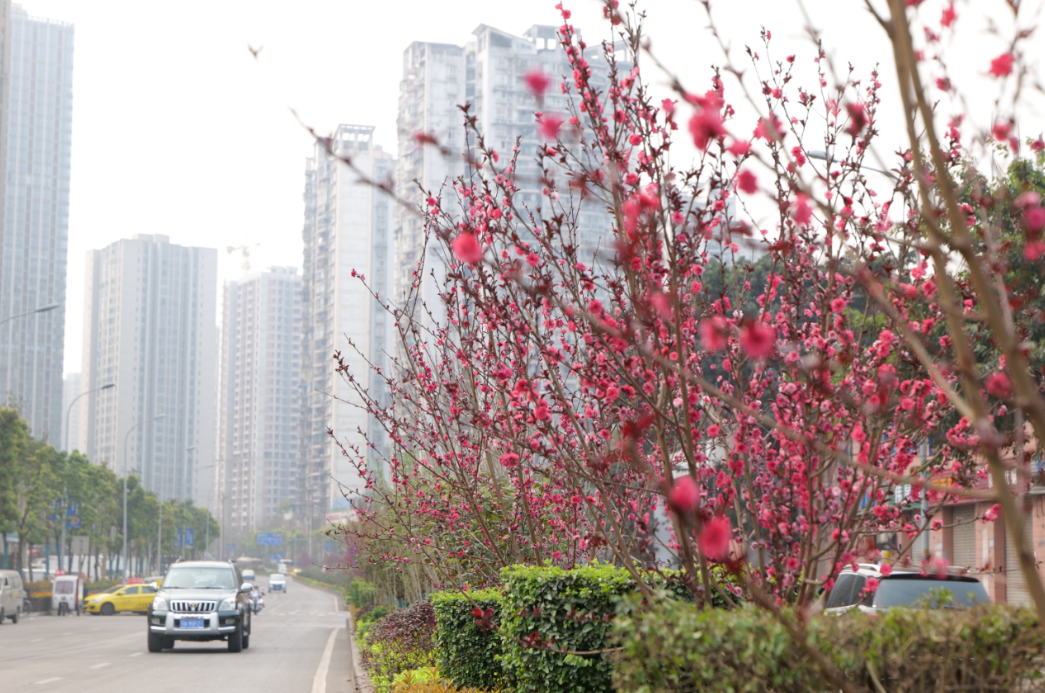 杨梨路桃树 沙坪坝区委宣传部供图沙坪坝区绿化处在沙坪坝区杨梨路、小新街、站南路绿地种植了不同品种的桃树,有照手桃、水蜜桃、百花香桃,它们花期大致相同,盛花时可漫步人行道,边走边打卡照相赏花地:杨梨路、小新街、站南路。
