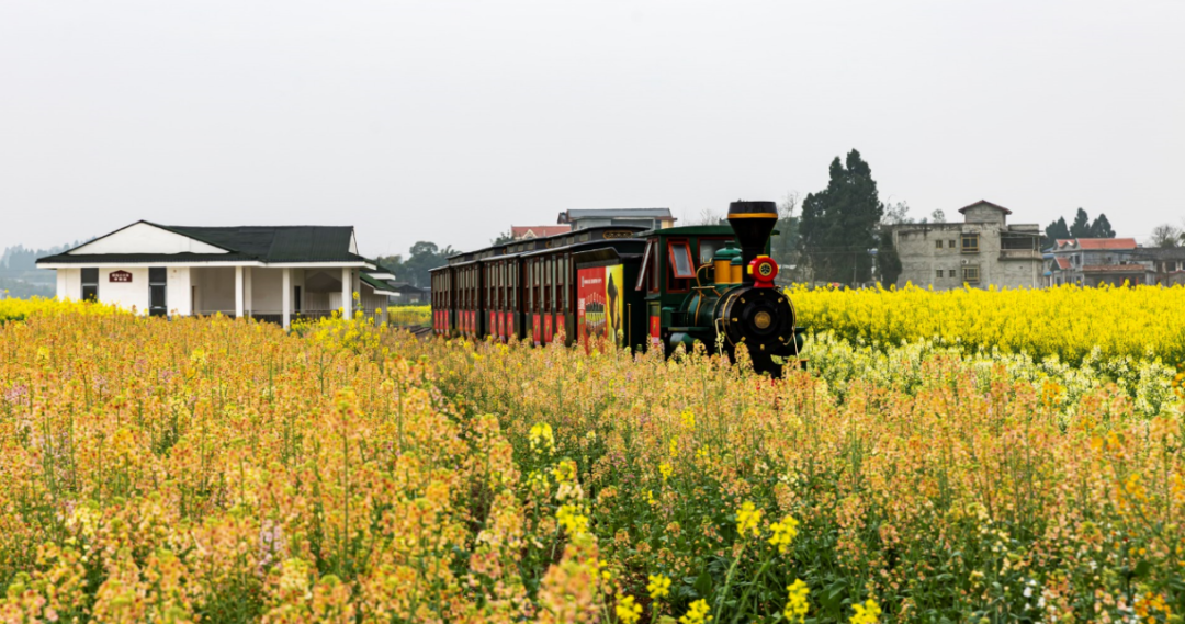 乘坐观光小火车畅游油菜花海 潼南区委宣传部供图在潼南区崇龛镇陈抟故里景区,满目是金色的海洋,满鼻是沁人的清香,勾勒出一幅鎏金四溢的花景今年,重庆·潼南陈抟故里菜花节花期更长、花类更多、花景更美、花灯更亮。