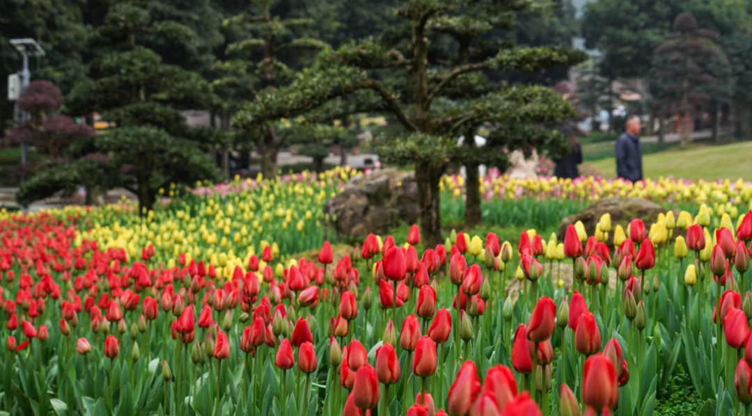 湿地花谷10万余株郁金香“花海”抢先亮相——园博园湿地花谷内郁金香已含苞待放湿地花谷引种的皇家红、皇家橙、皇家珊瑚等皇家系列和红色柔道、金色柔道等11个品种共10万余株的郁金香经近3个月的培育,已陆续开放。