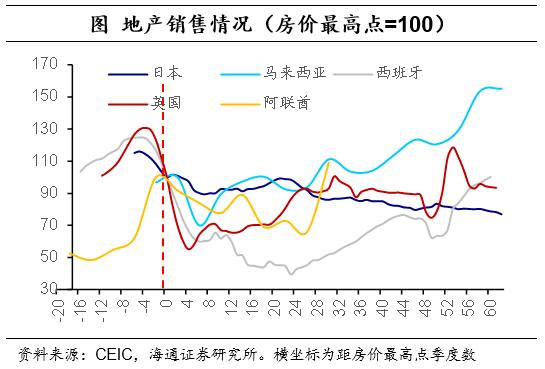 仅有马来西亚、阿联酋的地产销售再度回升至泡沫破裂前的水平,大致需要花费7年时间而日本则是陷入了长期的地产低迷期,地产销售在泡沫破裂后的较长一段时间,都在持续下行