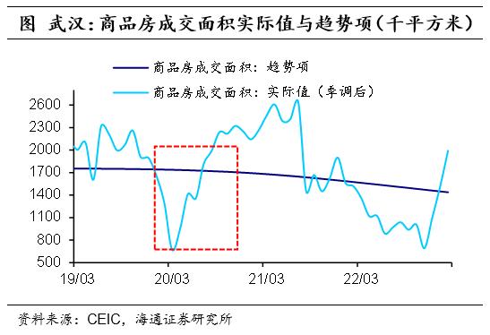 我们认为,当前地产市场的回暖,可能部分由于疫情期间积压的需求得到释放回顾过去几轮区域性疫情后地产市场的表现,我们发现,在短期疫情冲击后,国内房地产市场都出现了较明显的反弹例如,2020年的1-4月,武汉地产市场受到了较大冲击,商品房成交面积在3月跌至低谷,随着疫情影响减弱,在之后地产销售快速反弹超过趋势线。