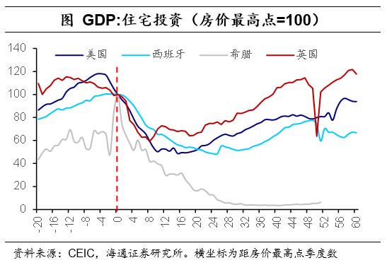而日本、希腊、中国香港等经济体,地产生产端回落时间较长,尤其是日本,直到泡沫破裂后75个季度,开工数据才到达底部从生产端数据的绝对值来看,在泡沫破裂十年后,多数经济体仍低于破裂前水平和销售端数据一样,各经济体的生产指标在见底回升后,也很难恢复到前期的高位。