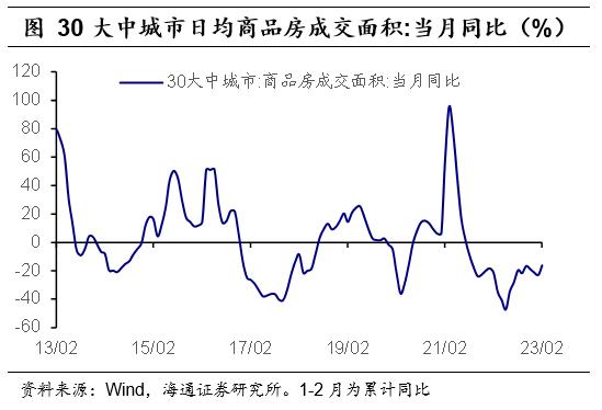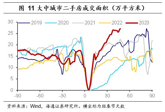 今年春节之后,国内房地产市场释放回暖信号从我们跟踪的高频数据来看,今年二手房销售明显偏高,新房销售则较去年跌幅收窄截至2023年3月10日,11城二手房累计成交面积达1202.45万平方米,为2017年以来历年同期最高值,较去年同比增加58.3%;30大中城市商品房累计成交面积为2378.44万平方米,与去年同期相比同比下降9.7%,相较于去年全年28.4%的跌幅明显收窄;从商品房销售的当月同比数据来看,3月1-11日同比增速为17.4%,为2021年5月以来首度回正。